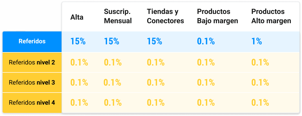 You will receive 15% of the joining fee, the monthly fee, the stores and connectors that your referrals take contracts out on. You will receive 1% from high margin products and 0.1% from low margin products (named brands) purchased by your referrals. In addition, from referrals that your referrals bring to us, you will receive 0.1% of their entire turnover, up to a maximum of 3 levels. For example: if you introduce 10 referrals that have a turnover of €100,000 you will receive approximately €10,000 per year. If you introduce 10 customers that have a turnover of €10,000 per year, you will receive approximately €2,600. If your referrals introduce new referrals, these amounts will be increased by 0.1% of their entire turnover. These examples have been created from real average data sourced from different types of BigBuy customers.