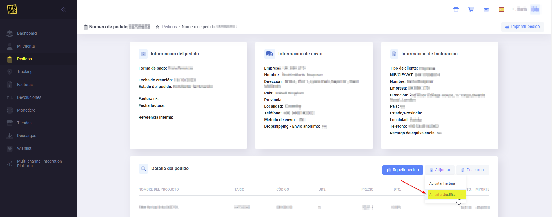 - Acceder a tu cuenta de BigBuy en Panel de Control > Pedidos > Pedido correspondiente.
