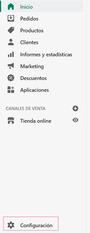 Para comprobar el dominio que tiene actualmente configurado en su tienda Shopify y modificar su configuración, debe acceder a la sección “Configuración” que se encuentra en el menú de la izquierda abajo del todo.