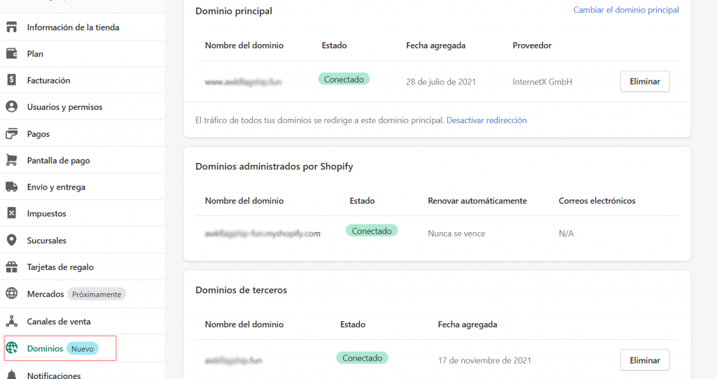 En la siguiente documentación oficial de Shopify encontrará más información relacionada con la configuración de los dominios en Shopify: https://help.shopify.com/en/manual/domains