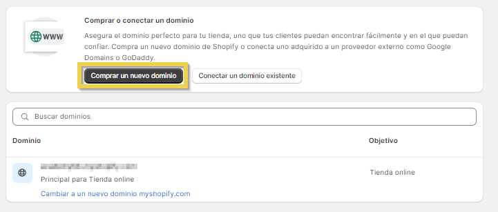 Shopify, por defecto, proporciona un dominio del tipo “nombre-tienda.myshopify.com”; para comprar un dominio en Shopify, tiene que acceder al panel de control de Shopify, hacer clic en Configuración y en Dominios.