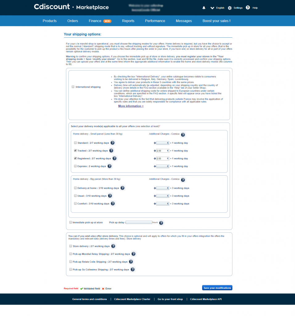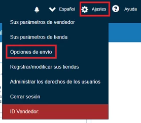 Para establecer las opciones de envío que va a ofrecer debe acceder al panel de control de Cdiscount y hacer clic en Ajustes > Opciones de envío.