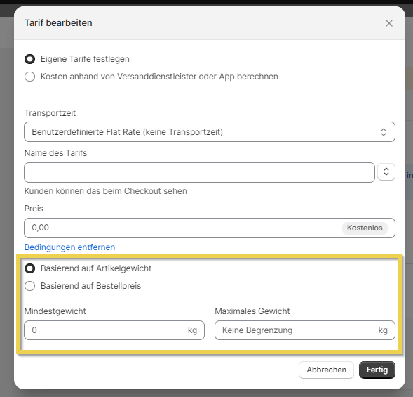 Konfigurieren Sie Ihre Tarife, je nach Bedarf, abhängig vom Gewicht des Artikels oder dem Bestellwert. Wir empfehlen, die erste Option zu wählen.