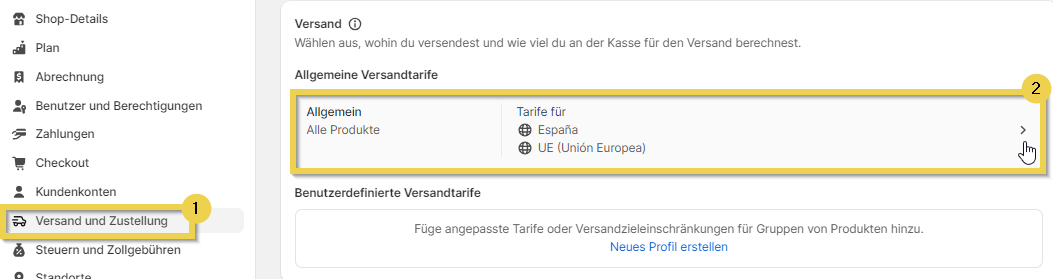 Gehen Sie auf Versandtarif hinzufügen und klicken Sie im Abschnitt Benutzerdefinierte Versandtarife auf Neues Profil erstellen.