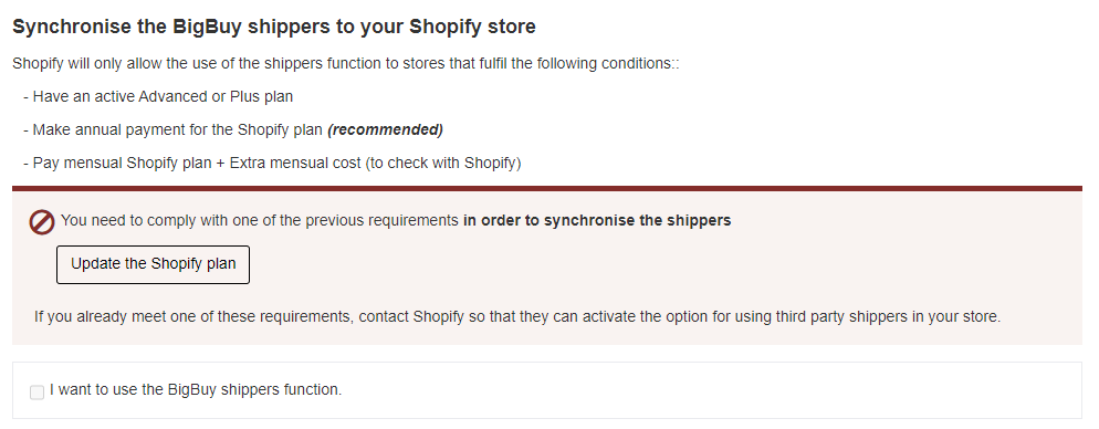 Installieren und Verwendung der Shopify-App von BigBuy - Dropshipping Carriers - BigBuy Academy | Documentación y ayuda técnica gratuita para clientes de BigBuy