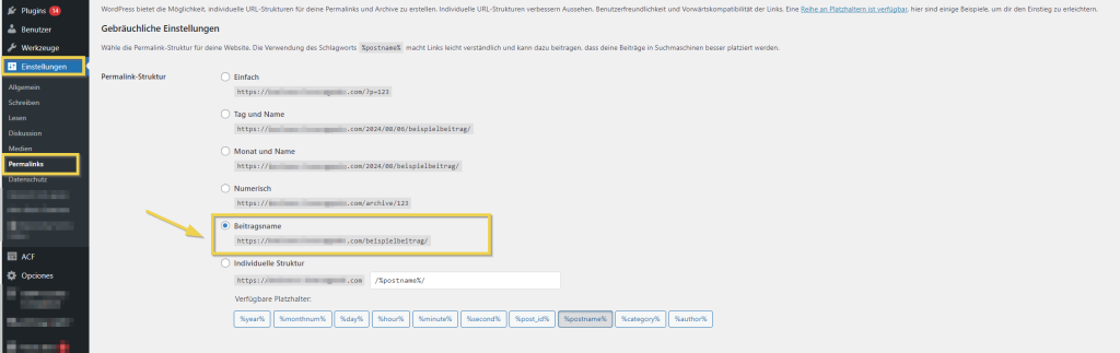 - Einstellungen → Permanente Verknüpfungen → Allgemeine Einstellungen und wählen Sie die Option Beitragsname