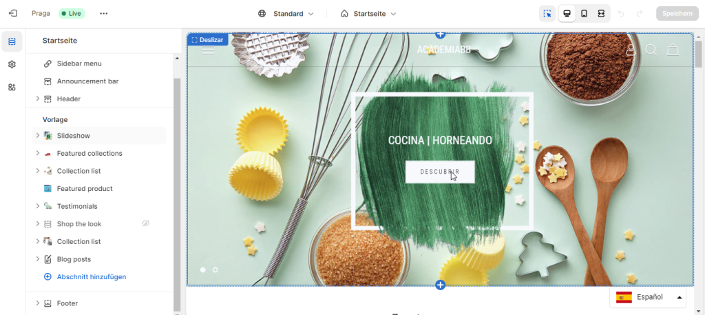 Dort können Sie das Layout und das Erscheinungsbild Ihres Shops ändern, indem Sie entweder die Abschnitte, deren Position oder die Elemente der einzelnen Abschnitte ändern.