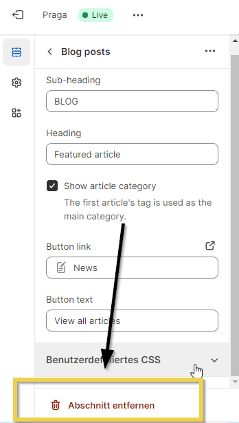 Und schließlich, um einen Abschnitt aus dem Theme zu entfernen, müssen Sie den Abschnitt auswählen, woraufhin unten die Schaltfläche Abschnitt entfernen erscheint, mit der Sie den ausgewählten Abschnitt entfernen können.