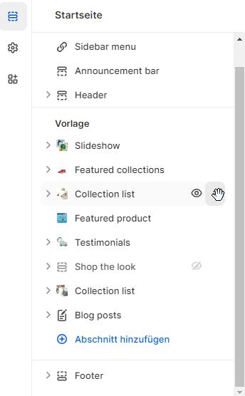 Auf der linken Seite des Bildschirms sehen Sie die Liste der Abschnitte, die in Ihrem Shop-Theme konfiguriert sind.
