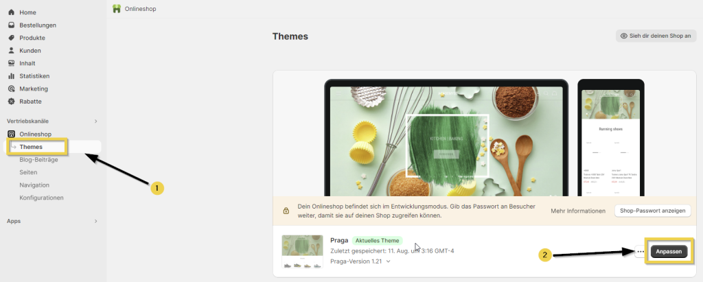 Rufen Sie das Shop-Dashboard auf, klicken Sie auf den Abschnitt Online-Shop > Themen und klicken Sie auf das aktive Thema, klicken Sie auf Anpassen: