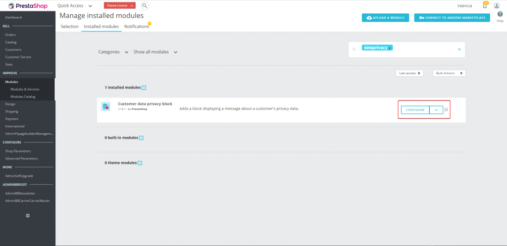 1. Gehen Sie zum Abschnitt Module > Installierte Module. Suchen Sie nach GDPR und klicken Sie, wenn das Modul erscheint, auf Konfigurieren.