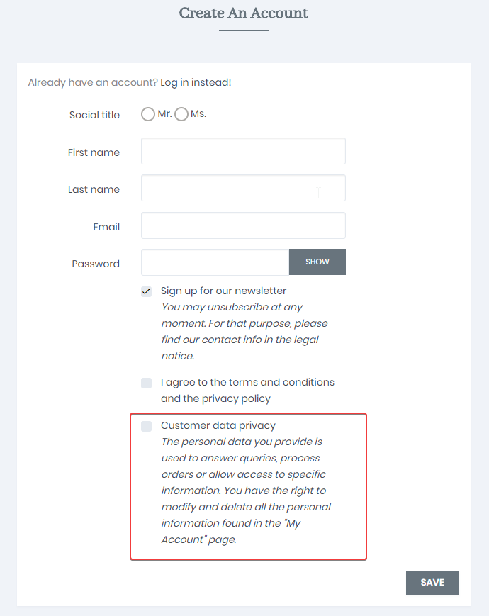 - Passen Sie die Kästchen an, die Benutzer ankreuzen müssen, um ihre Zustimmung zu geben, und die Nachrichten in den verschiedenen Formularen in Ihrem Shop, z.B. für die Erstellung eines Kontos und das Abonnieren des Newsletters.