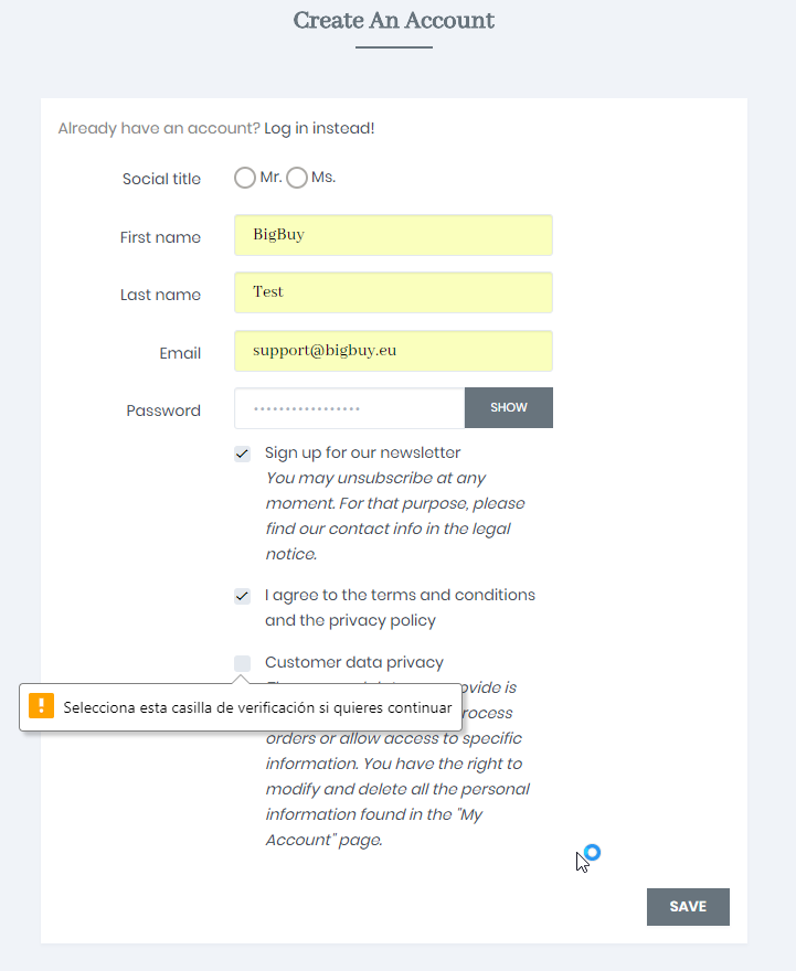 Der Benutzer, der das Formular ausfüllt, kann nur dann auf Speichern klicken, wenn er den neuen Check angekreuzt hat. Wenn nicht, erscheint eine Warnmeldung, die Sie daran hindert, sich zu registrieren.