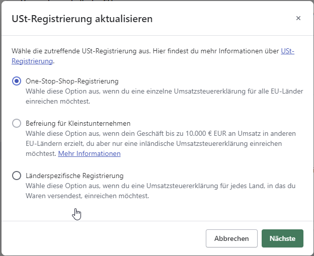 Im Abschnitt Einrichten Ihrer Mehrwertsteuerregistrierungen in diesem Shopify-Artikel finden Sie weitere Informationen darüber, wie Sie jede dieser Optionen vervollständigen.