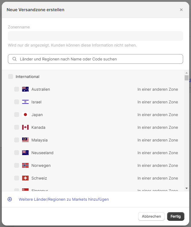 - Wählen Sie die Versandzone, die Sie erstellen möchten. Sie können Länder und Regionen nach Namen oder Code suchen.