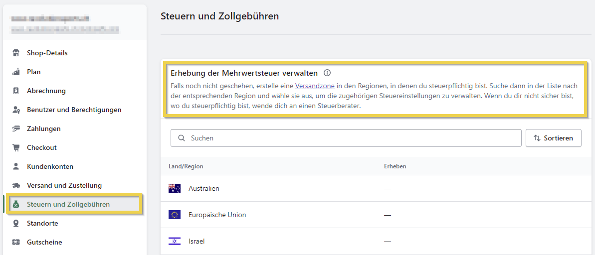 - Nachdem Sie die Zonen erstellt haben, gehen Sie im linken Menü zum Abschnitt Steuern und Abgaben.