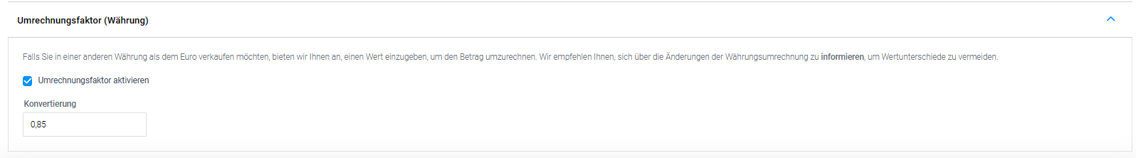 Mit der Funktion Umrechnungsfaktor (Währung) können Sie den gewünschten Wechselkurs auf die Währung einstellen, mit der Sie in Ihrem Shop arbeiten möchten.