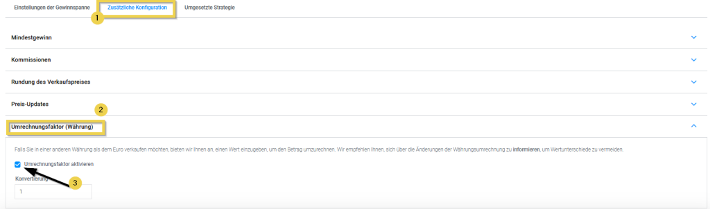 2. Aktivieren Sie im Abschnitt Zusätzliche Konfiguration die Option Umrechnungsfaktor (Währung).