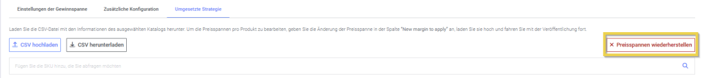 Falls Sie mit der Konfiguration Ihrer Preisstrategie bei 0 beginnen möchten, können Sie die in der Zusatzkonfiguration angewendeten Preisspannen wiederherstellen. Kliclen Sie Sie auf Preisspannen wiederherstellen.