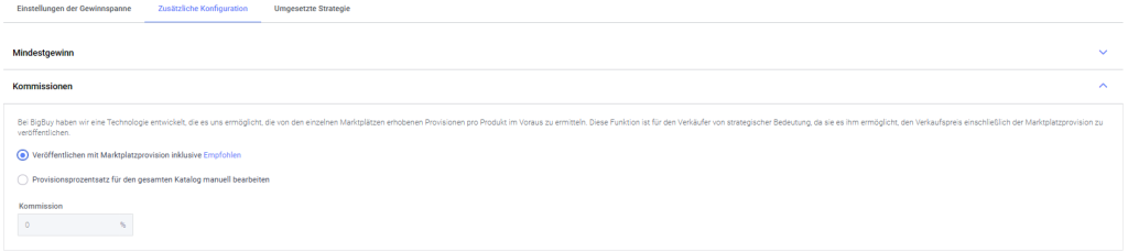 Wenn Sie die empfohlene Option aktivieren, sendet uns die von BigBuy entwickelte Technologie vorab die vom Marktplatz erhobene Provision, so dass wir den Verkaufspreis inklusive der entsprechenden Provision veröffentlichen können.