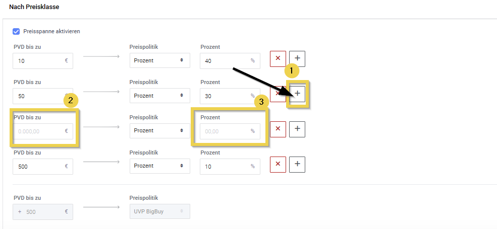 Es gibt Standardregeln, die Sie bearbeiten können. Wir empfehlen Ihnen, neue Preisspannen hinzuzufügen. Klicken Sie auf das + und legen Sie einen maximalen HP fest, da wir einen sehr umfangreichen Katalog haben und jede Spanne viele Referenzen enthalten kann.