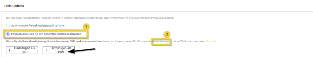 Fügen Sie die SKUs der gewünschten Produkte hinzu, entweder einzeln oder über eine CSV-Datei, um später den gewünschten Preis in Ihrem Vertriebskanal anzupassen.