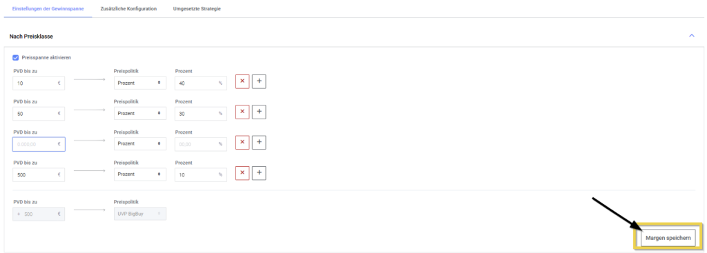 Wenn Sie diese nicht speichern, werden die Gewinnprozentsätze nicht in die Preisstrategie übernommen.
