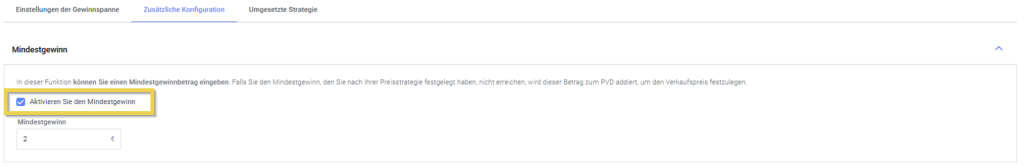 Mit der folgenden Option können wir für alle Verkäufe, die wir tätigen, einen Mindestsicherheitsgewinn festlegen. Wenn wir zum Beispiel “2” angeben, legt das System Preise fest, bei denen der Mindestgewinn immer 2 € beträgt.