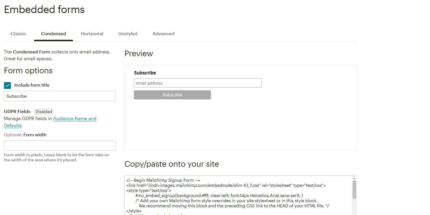 Wenn Sie sich im Abschnitt “Embedded forms” befinden, gehen Sie auf die Registerkarte “Condensed”.