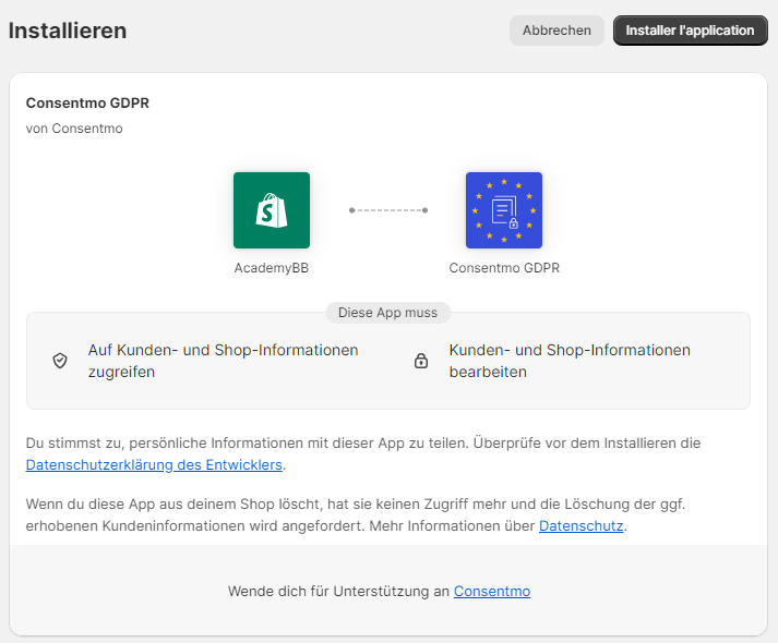 Für die Verwaltung von Cookies und deren Einhaltung empfehlen wir Ihnen, die Anwendung GDPR/CCPA + Verwaltung von Cookies von Shopify herunterzuladen.