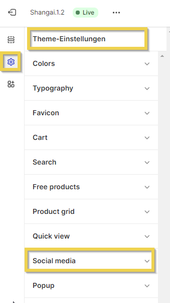 In Shopify werden die Social-Media-Symbole standardmäßig durch die aktive Theme im Shop eingestellt. Diese Symbole werden normalerweise in der Fußzeile des Shops (Footer) oder auf einer Produktseite angezeigt. Je nach Theme können bestimmte Social-Media-Symbole aktiviert/deaktiviert werden.