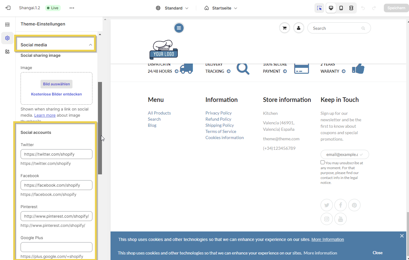 In Shopify werden die Social-Media-Symbole standardmäßig durch die aktive Theme im Shop eingestellt. Diese Symbole werden normalerweise in der Fußzeile des Shops (Footer) oder auf einer Produktseite angezeigt. Je nach Theme können bestimmte Social-Media-Symbole aktiviert/deaktiviert werden.