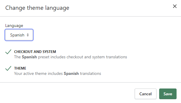 - Wählen Sie die gewünschte Sprache und versichern Sie sich, dass sowohl Checkout and System als auch Theme markiert sind, dann klicken Sie auf Save. Das bedeutet, dass sowohl der Warenkorb als auch der Rest des Themas in der von Ihnen gewählten Sprache sind.