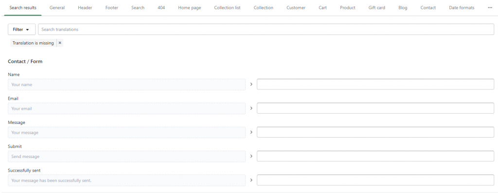 - Nach dem Filtern sehen Sie die Felder, für die es keine Übersetzung in der gewünschten Sprache gibt, damit Sie sie selbst eingeben können. Es handelt sich dabei zumeist um Felder in Kontaktformularen und andere Felder, die dem Thema später hinzugefügt wurden.
