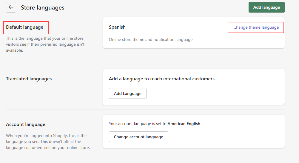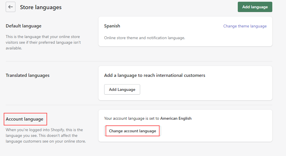 Dazu gehen Sie zu Settings > Account language > Change account language. Alternativ können Sie auch dieser Academy Schritt für Schritt folgen: Cómo cambiar el idioma del panel de control de la tienda Shopify.