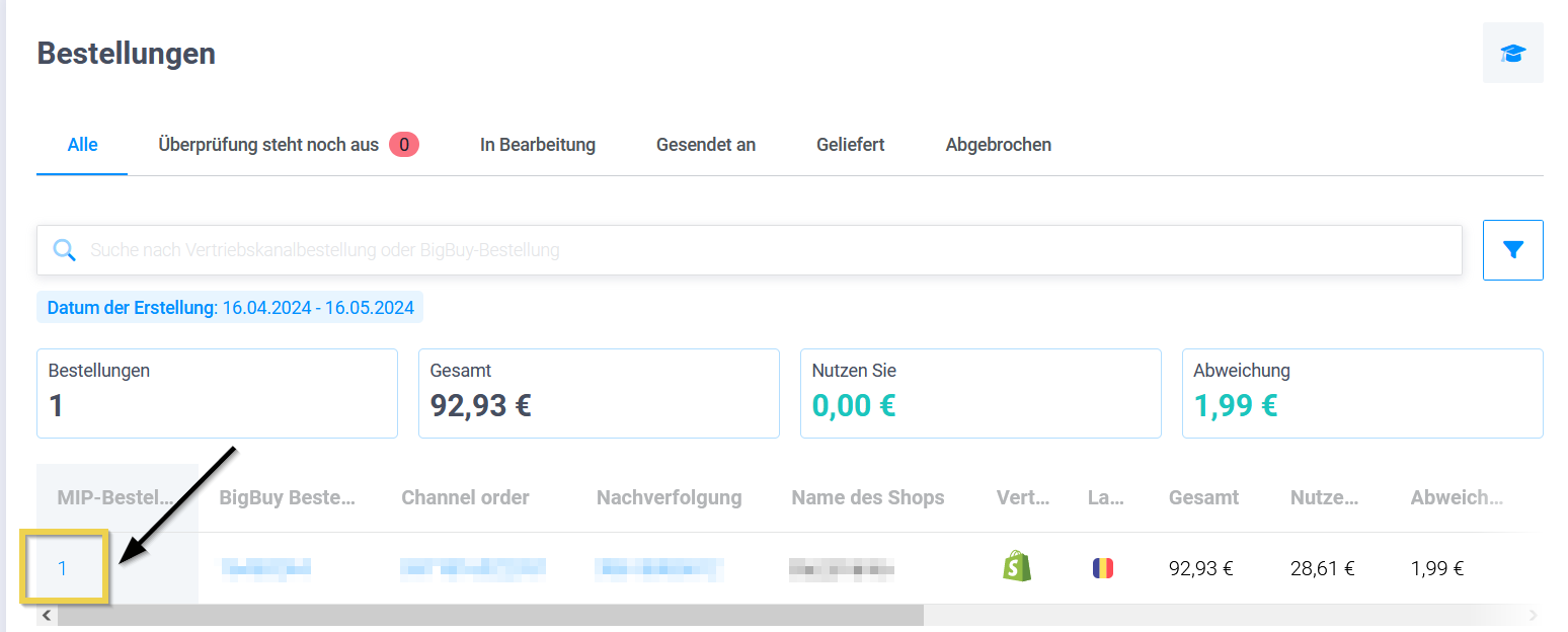 Wenn Sie die Details einer Bestellung sehen möchten, klicken Sie auf die MIP-Bestellnummer auf der linken Spalte der Bestellzeile: