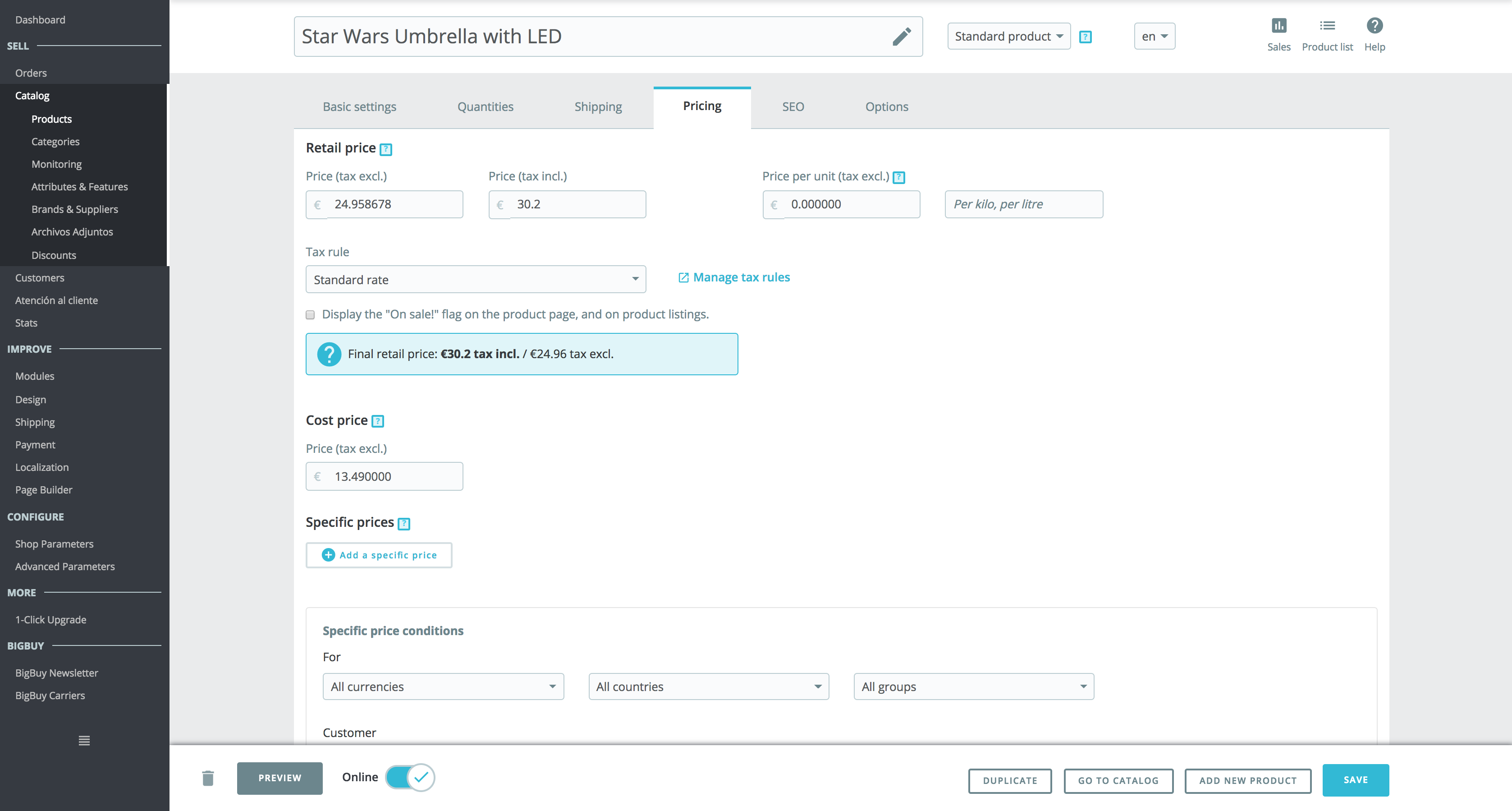 1. Go to the back office of Prestashop> Products. Once in the Products section, look for the product to which you want to apply a discount and enter it. Once inside, go to the Pricing tab and click on “Add a specific price”.
