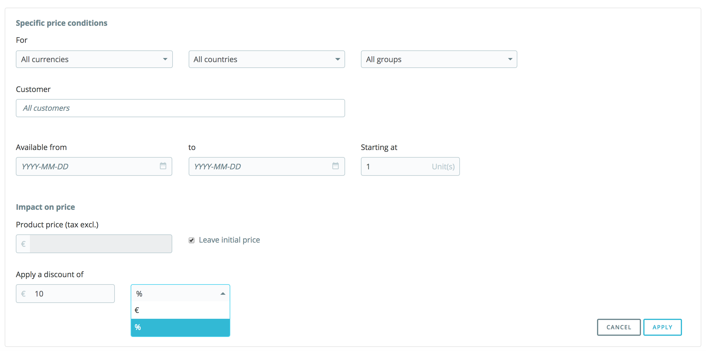 - Write the discount you wish to apply. Choose whether to enter a discount percentage (such as 10%) or directly a specific discount (such as 10€).