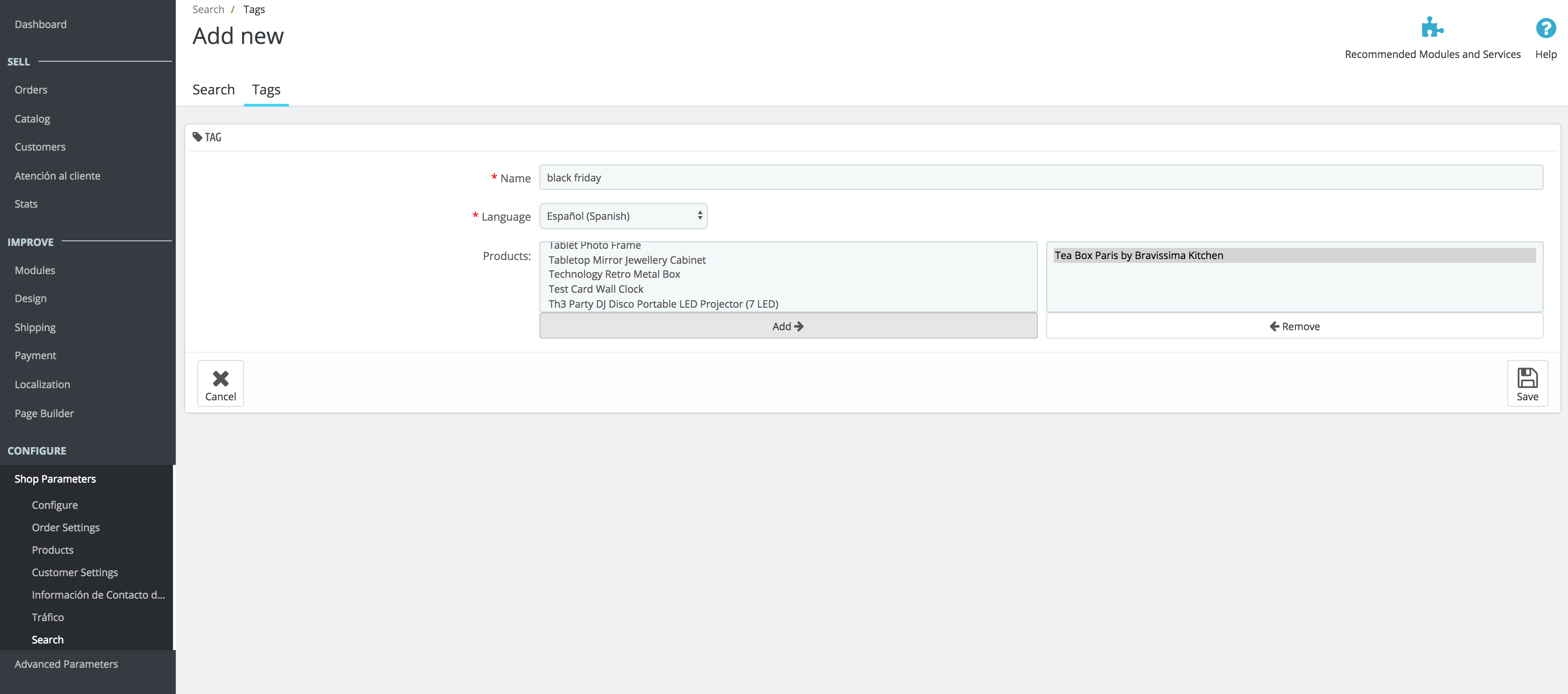 2. Write the name for the tag that you wish to create. For example, “Black Friday”. Next, select the products in the list to which you want to add this tag, and click on Add so they move to the column on the right. Once selected, click on Save.