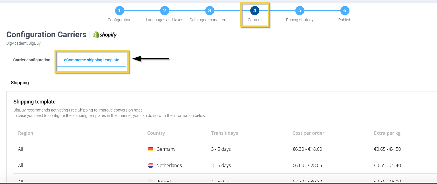 In the “Shippers” step on the Multichannel, in the tab “eCommerce shipping template, you will find a table showing information on shipping costs to some countries. This table is a useful tool for setting shipping costs, but it is important to keep in mind that it only shows the costs for some countries.