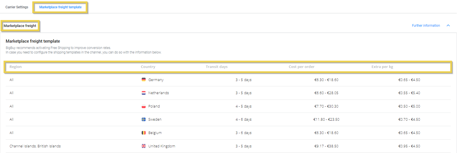 Before starting the shipping cost configuration on Amazon, it is important to understand the associated costs. In the Carriers section then Marketplace Freight Template > Marketplace freight, we provide a table that includes approximate shipping price ranges: