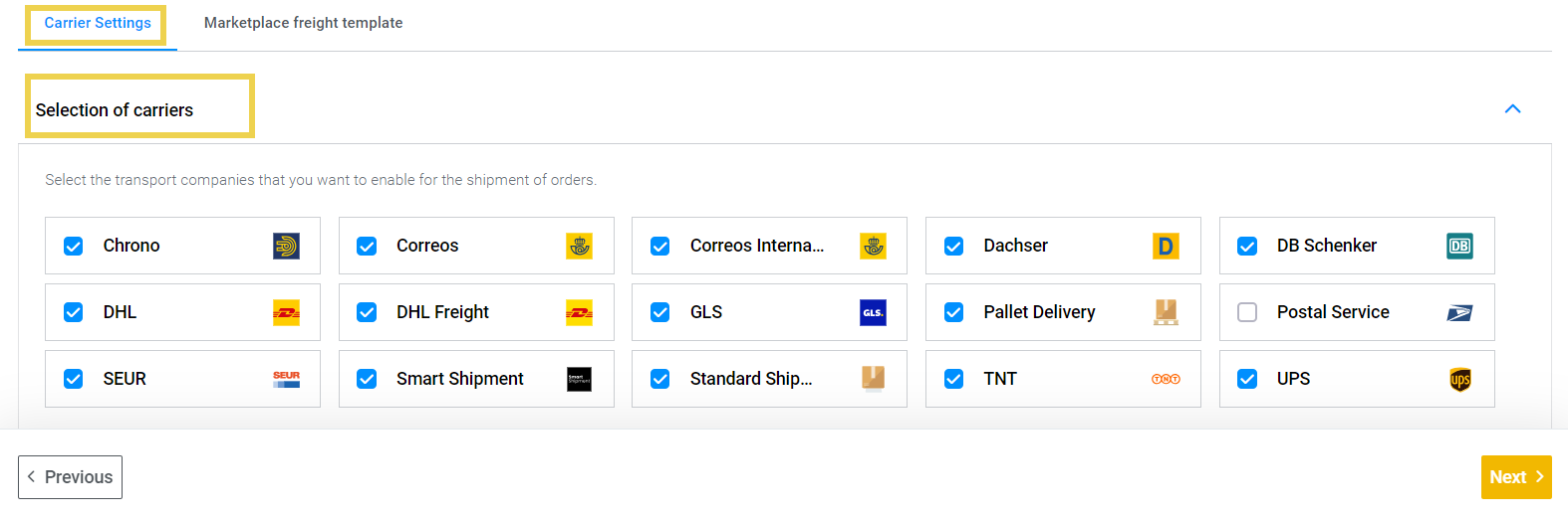 - On the MIP, indicate the same name you have given to the template created before. Add it to Carriers > Marketplace freight template < Default shipping templates.