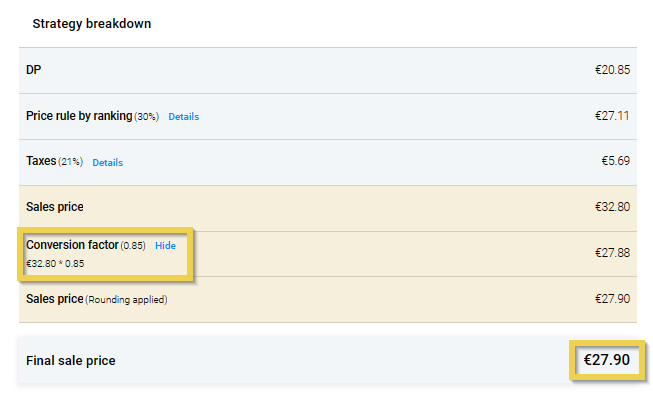 Example: If, for example, your currency is the Pound, you will use a conversion factor of 0.85. Then the product price will be reduced when multiplied by 0.85. A product that costs €10 will equate to £8.50.