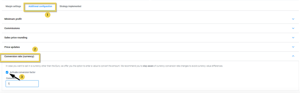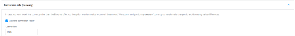 - If the conversion of your currency usually ranges between 0.80 and 0.90, it is advisable to set an average conversion, such as 0.85. That way, you won’t need to edit it every time the currency conversion rate fluctuates slightly.