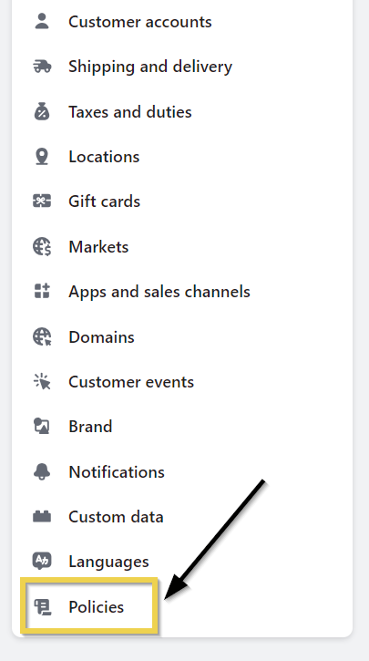 A window will open with different configuration elements of your shop. You will need to search for the Policies section and click on it.