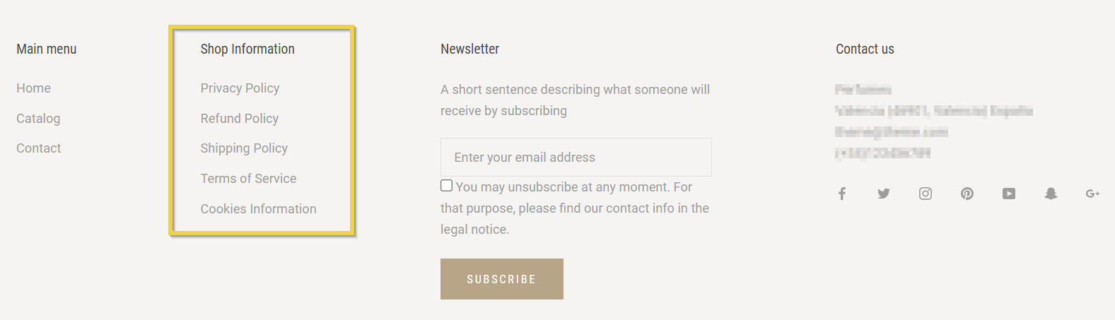 Upon receiving your 360 shop, you will see that the footer includes links to legal information about your shop: