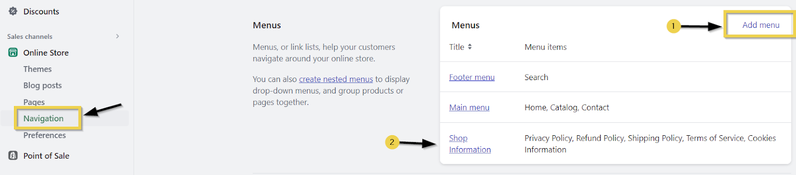 If you want to make any changes to your shop’s default structure, go to the Online Shop section in the Shopify dashboard menu and select the Navigation option.