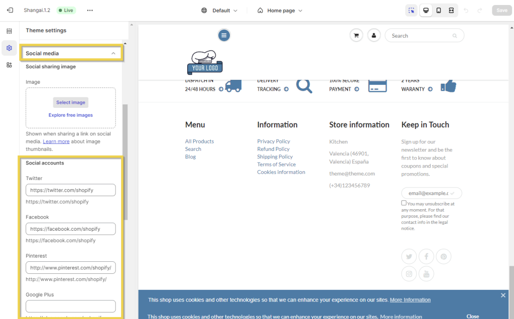 At Shopify, social network icons come set up by default according to the active theme of the store. These icons can usually be found in the store footer (bottom of the page) or a product file. Depending on the theme, certain social network icons can be activated/deactivated.