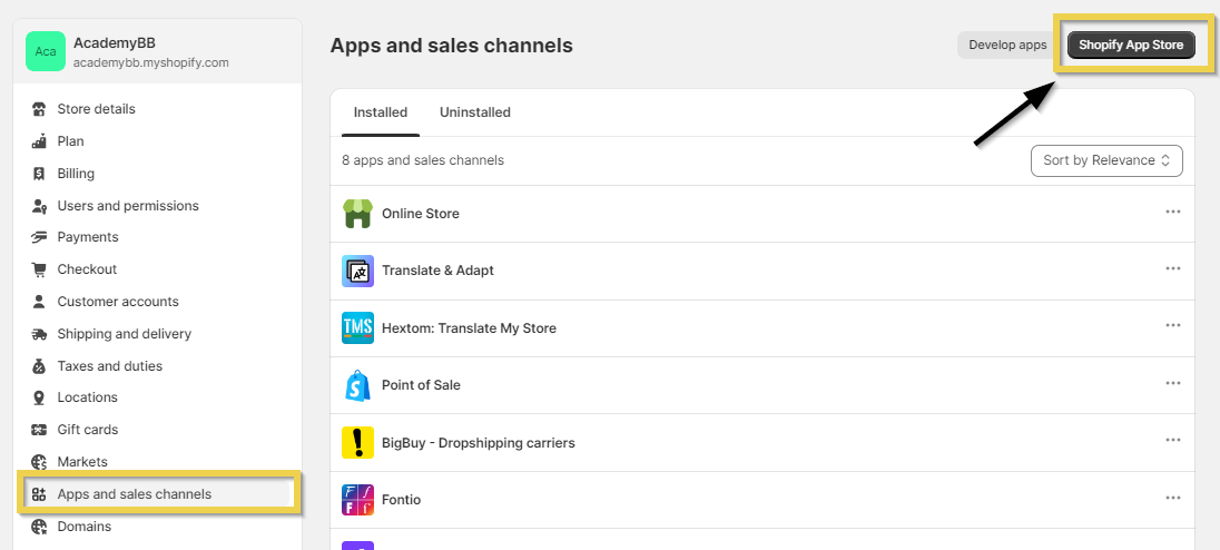 Go to the Applications and sales channels section and then head to the Shopify app store.