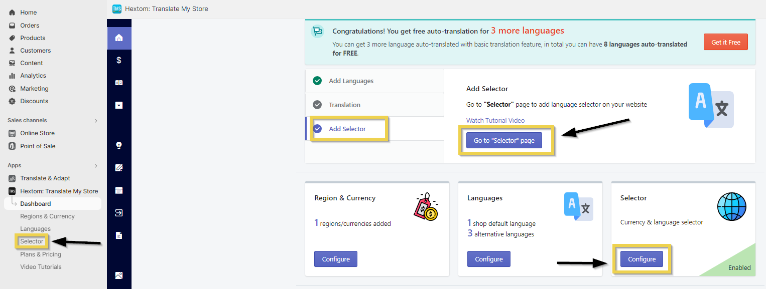 By default, this app scans the store and carries out a machine translation of the languages added in your Shopify Backoffice, and you can jump between them thanks to a selector. To configure it, go to the home screen and access the selector configuration section in any of the following ways.
